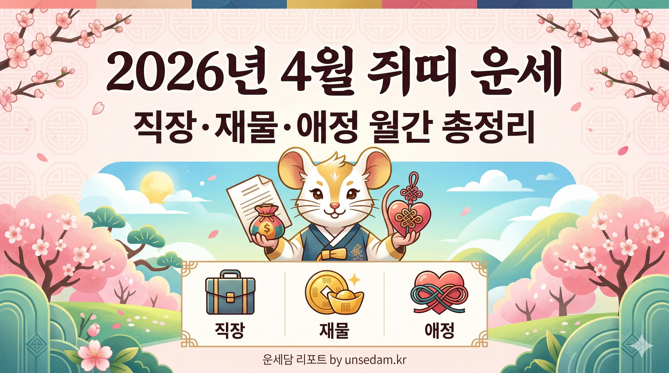 | 설명(Meta) | 2026년 4월 쥐띠의 월간 운세를 직장·재물·애정 세 분야로 상세 분석합니다. 이달의 길일, 주의 시기, 개운 팁까지 한 번에 확인하세요. |